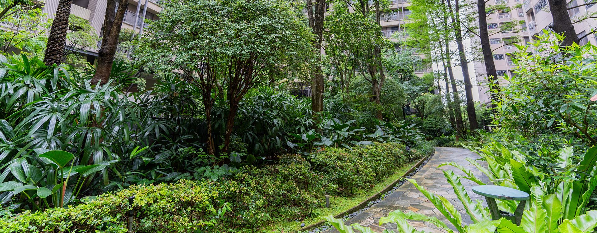 廣達400坪的頂樓平台,闢建為薄層綠覆庭園,以禪意空間為主調,佈局「婉曲步道」、「竹林禪境」、「陶藝花圃」、「天地幽微」等景點,靜態的休憩意象,給都市人一處釋放壓力、沉澱冥想的身心靈療癒空間。